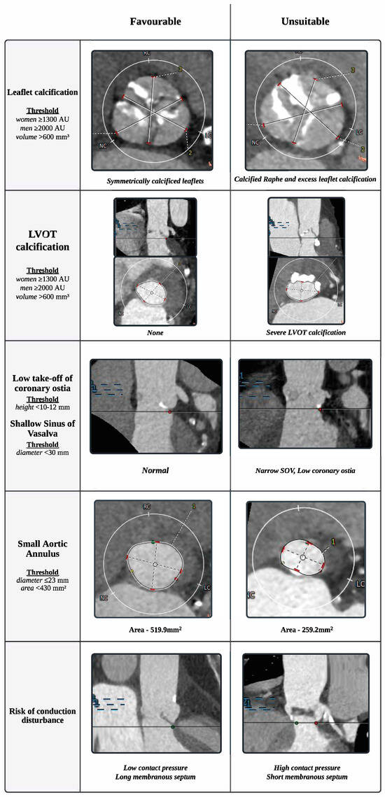 The current evidence favoring TAVI over SAVR is largely derived from studies conducted in carefully selected patient groups; however, patients with complex anatomies have been systematically excluded from landmark studies [8,12]. For instance, in the PARTNER3 [20] and EvolutLowRisk trials [21], a significant proportion of patients (33% and 15%, respectively) failed the screening process, underscoring potential limitations in generalizing these recommendations for subgroups with specific anatomical complexities. Indeed, anatomical risk stratification continues to play a decisive role in determining the appropriate treatment between SAVR and TAVI, with SAVR being the preferred option for patients who present with anatomical features unfavorable for TAVI (Figure 1), including extensive annular and left ventricular outflow tract (LVOT) calcifications, extreme aortic annulus diameters, low coronary heights, and bicuspid aortic valve. Moreover, SAVR remains the preferred option for patients with extended indications requiring greater procedural versatility, such as isolated aortic regurgitation, the need for additional interventions for concomitant conditions, or inadequate peripheral access.