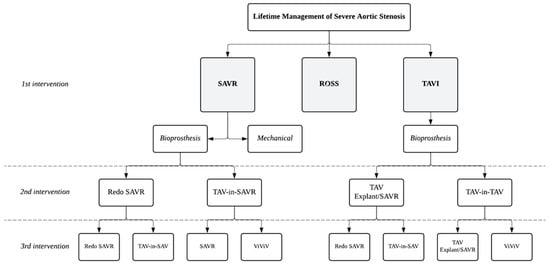 Lifetime Management Strategies for Severe Aortic Stenosis: Sequential Intervention pathways. Abbreviations: SAVR—Surgical Aortic Valve Replacement, TAVI—Transcatheter Aortic Valve Implantation, ViViV—Valve-in-Valve-in-Valve.