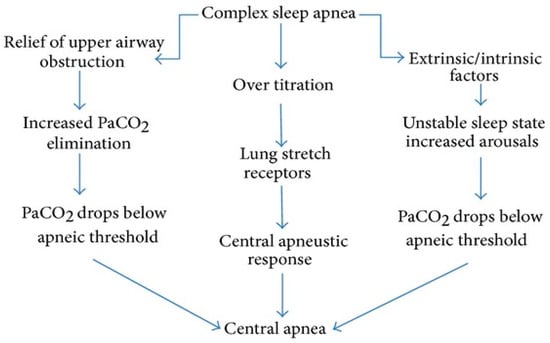 CSA associated with titration or CPAP therapy (emergent CSA, previously referred to as “complex sleep apnea”) may occur during the first CPAP titration for primary OSA (6.5%), and it is mainly due to ventilatory instability caused by CPAP’s effect on carbon dioxide regulation. Only 1.5% of patients develop persistent CSA associated with long-term persistent CPAP therapy. Key pathways leading to central apnea in complex sleep apnea are characterized by relief of upper airway obstruction, when CPAP therapy eliminates airway obstruction, leading to increased ventilation causing excess CO2 elimination, lowering arterial PaCO2. If PaCO2 drops below the apneic threshold, the brainstem’s respiratory drive is inhibited, resulting in central apnea. Another causing mechanism can be the over-titration of CPAP pressure, when excessively high CPAP pressure can overstimulate lung stretch receptors, which triggers a central apneustic response, possibly leading to central apneas. Furthermore, factors such as sleep fragmentation, arousals, and underlying ventilatory instability can further contribute to CO2 fluctuations. An unstable sleep state with frequent arousals may increase the likelihood of PaCO2 dropping below the apneic threshold, leading to central apnea (Figure 1) [1,15].