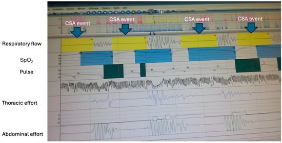 Primary (idiopathic) CSA has an unknown etiology characterized by CSA without CC-SA pattern [10,16,17]. It can be described when ≥5 CSA occur, each >10 s/h of sleep. PaCO2 is normal or low. CSA ends abruptly with a large breath and without associated hypoxemia. It is rare (one study highlights 3.8% of 650 CSA diagnosed by PSG) [18]. In the history of the sleep laboratory of the Pulmonology Clinic of Targu Mures, the cases were severe and were associated with cognitive decline/dementia and arrhythmias without being able to establish a link between them as triggering factors or as consequences of CSA.