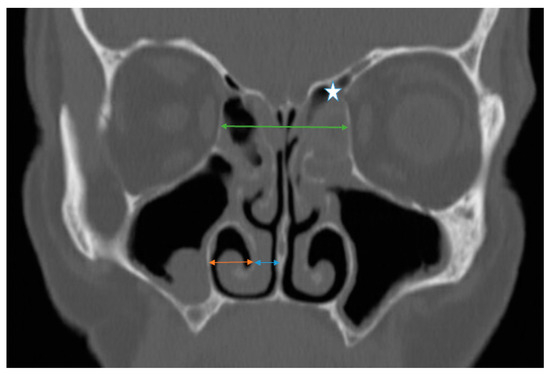Sinus computed tomography scan, coronal plane. Star: the left anterior ethmoid artery. Green line: IOD in the coronal plane (IODCoronal). Orange line: distance between the lateral border of the inferior turbinate to the lateral nasal wall (ITL). Blue line: distance between the medial border of the inferior turbinate and the septum.