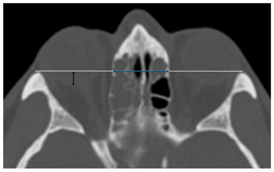 The antero-posterior position of the globe was measured in the axial plane on CT, using a horizontal line drawn from the medial tip of the lateral orbital rim to the contralateral orbital rim. The distance was measured from the horizontal line to the posterior edge of each globe passing through its midline (Figure 2).