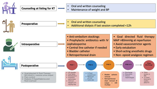 - Espino, K.A.; Narvaez, J.R.F.; Ott, M.C.; Kayler, L.K. Benefits of multimodal enhanced recovery pathway in patients undergoing kidney transplantation. Clin. Transplant. 2018, 32, e13173. [Google Scholar]