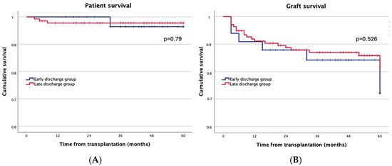 After five years of follow-up, graft function [serum creatinine: 1.99 (0.6–13.07) mg/dL vs. 1.8 (0.68–12.0) mg/dL, p = 0.414], patient survival (97.0% vs. 97.8%, p = 0.790), and graft survival (81.8% vs. 84.7%, p = 0.526) were similar between the “early discharge group” and “the late discharge group” (Figure 3).