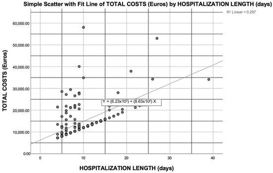 The costs incurred during the first hospitalization (when KT was performed) accounted for 57% of the first-year costs after transplantation, and this figure rose to 83% when the surgical costs of the first hospital admission were excluded from the cost analysis. However, different lengths of hospital stay during the first admission explained only about 29% of the variability in the costs for the first year after KT (R2 = 0.297), as detailed in Figure 4. Other factors that significantly affected the costs of the first year post-KT for patients experiencing DGF included the age of the recipient (p = 0.028) and receiving a graft from an ECD (p = 0.04), although these variables had a lesser impact on the costs incurred in the first year than the LOS itself (R2 = 0.31 and R2 = 0.312, respectively). Thus, none of the other recipient characteristics (BMI, gender, region of origin, and one or more comorbidities, including cardiovascular diseases and type 2 diabetes) nor CIT significantly impacted the total costs of the first year after KT.