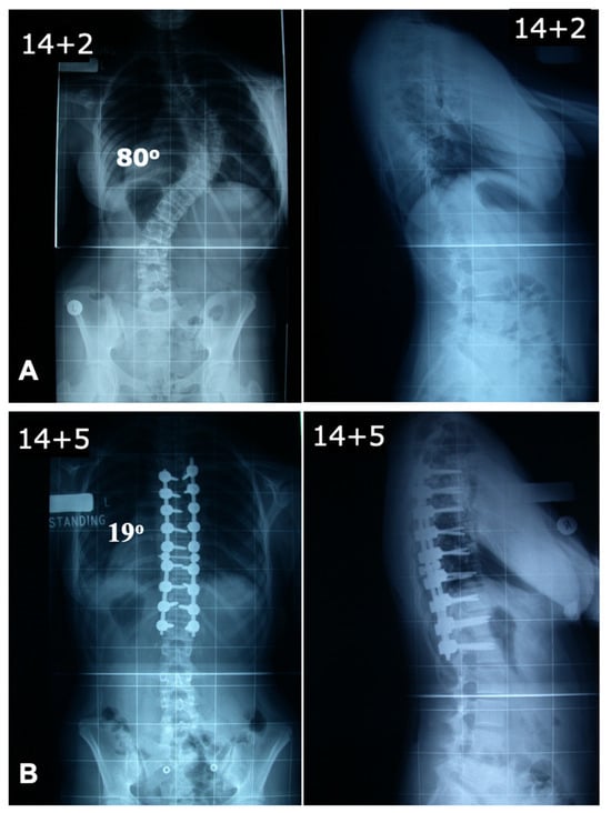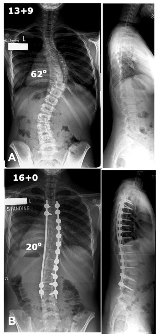 Deformity correction using double-rod technique. (A) Preoperative antero-posterior and lateral radiographs showing a thoracic scoliosis with a Cobb angle of 80 degrees. (B) Postoperative radiographs showing good deformity correction with coronal and sagittal balance.