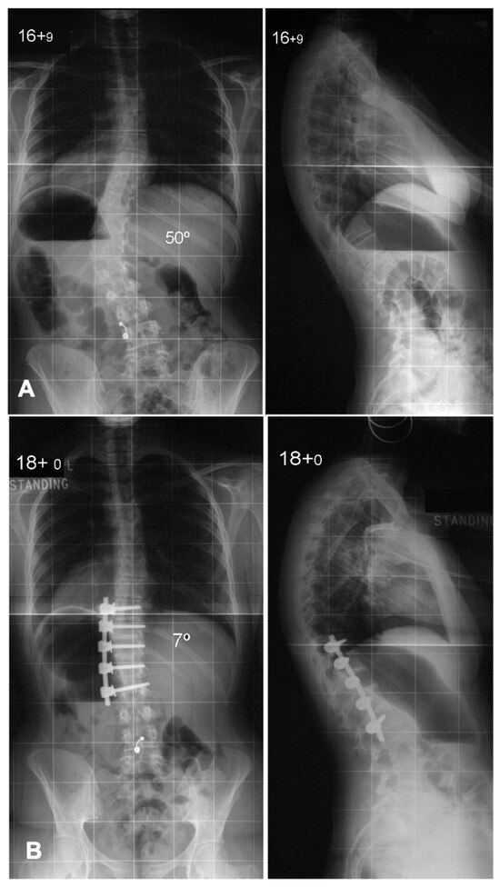- Urquhart, D.S.; Gallella, S.; Gidaris, D.; Brady, E.; Blacklock, S.; Tsirikos, A.I. Six-Year Follow-up Study on the Effect of Combined Anterior and Posterior Spinal Fusion on Lung Function and Quality of Life in Young People with Adolescent Idiopathic Scoliosis. Arch. Dis. Child. 2014, 99, 922–926. [Google Scholar] [CrossRef]