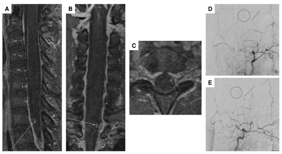 2. Donauer, E.; Aguilar Perez, M.; Jangid, N.; Tomandl, B.; Ganslandt, O.; Henkes, H. Spontaneous Cervical Intramedullary and Subarachnoid Hemorrhage due to a Sulco-Commissural Artery Aneurysm. Clin. Neuroradiol. 2019, 29, 777–781. [Google Scholar] [CrossRef] [PubMed]