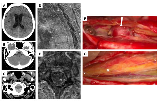 Figure 2. Noncontrast head CT in the transversal plane showing minor subarachnoid hemorrhage, primarily in the right temporoparietal region (A), and distinct subdural hemorrhage in the posterior fossa, particularly involving the craniocervical junction (B,C). High-resolution contrast-enhanced MR angiography (ceMRA extreme) in the sagittal (D) and transversal (E) planes, showing a suspected perimedullary aneurysm dorsolaterally on the left at the T2 level (arrows), measuring approximately 3 mm in diameter. Intraoperative visualization of the aneurysm ((F), arrow). Post-resection view following coagulation of the feeding artery, showing no residual aneurysm (G).