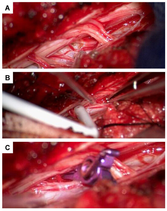 For further diagnostic exploration and therapeutic intervention, the patient was then transferred to our hospital. Angiography detected a perimedullary fistula with an associated aneurysm at C2, fed by a radiculomedullary artery arising from the left vertebral artery at the C3/4 level (Figure 4A–C). Attempting interventional occlusion was challenging due to potential flow reversal and incomplete occlusion. Therefore, surgery proceeded. A C3 hemilaminectomy and durotomy were performed (Figure 5A). Subsequent ultrasonography and micro-Doppler could localize the aneurysm intramedullarily in the anterior part of the spinal cord (Figure 5B). Given the potential for severe morbidity from dissecting the aneurysm in the anterior part of the spinal cord, verification of aneurysm occlusion was exclusively achievable through ultrasonography and micro-Doppler (a clear signal was detected when inspecting the spinal cord). The lateral radicular vessels were explored, revealing an atypical vessel, which was carefully dissected and closed with forceps. Micro-Doppler was repeated in the suspected aneurysm area, but the signal was no longer detectable as the suspicious vessel was occluded. Intraoperative neuromonitoring (IONM) remained stable. Then, the suspicious radiculomedullary artery was occluded with a hemoclip, and IONM remained stable, confirming that the suspicious artery was not a vital spinal cord vessel, so its occlusion would not pose any risk of ischemic complications (Figure 5C). The radiculomedullary feeder was coagulated and cut. Micro-Doppler and ultrasonography confirmed the absence of a signal in the suspected aneurysm area. The neurological examination at discharge on the 8th postoperative day revealed mild-to-moderate muscle weakness, particularly on the left side (strength 3–4/5).