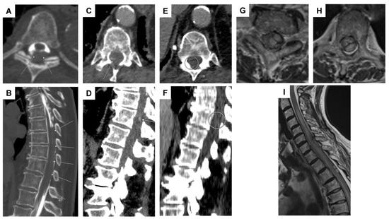 Figure 6. Case 4: imaging series illustrating suspected thoracic sub-/intradural bleeding and contrast-enhanced findings potentially indicative of active hemorrhage. CT myelography ((A,B): transversal and sagittal planes) showed evidence of an extensive dorsal sub-/intradural hemorrhage of the thoracic spine (arrows). Transversal (C) and sagittal (D) planes of a body CT scan in the portal-venous phase revealed a streak-like spinal contrast enhancement at the T11 vertebral level, located most likely perimedullarily and dorsolaterally on the right (arrows). This finding, considered a potential “spot sign,” suggested possible active spinal bleeding, likely related to apixaban therapy. Nine days later, a follow-up CT scan in the portal-venous phase ((E,F): transversal and sagittal planes) did not reveal signs of active spinal bleeding any longer, as the suspicious contrast-enhanced lesion at the T11 level had disappeared (circled region). Note: an initial thoracic and lumbar DSA did not reveal any vascular pathology (not shown). Case 5: transversal planes at the levels of C7 (G) and T3 (H), alongside a sagittal view (I) on an MRI T2-weighted sequence, demonstrate a space-occupying intradural hematoma extending from C6 to T3 on the left side. The hematoma exhibited a crescent-shaped configuration, displacing and compressing the spinal cord to the right both ventrally (G) and dorsally (H). Additionally, subarachnoid hemorrhage components extended caudally, and a long-segment myelopathy was evident, spanning from C3 to T6.