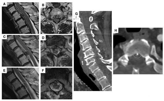 Figure 7. Spinal MRI of acute and subacute epi-/subdural hemorrhage with a suspected thrombosed perimedullary aneurysm at the T1/2 level. Initial MRI showed an acute epi-/subdural hemorrhage extending ventrally from levels C1 to T4, with maximal prominence at level T1 (arrows; T2-weighted sequence in the sagittal (A) and transversal planes (B)). The follow-up MRI five days later ((C): sagittal T2-weighted sequence; (D): transversal contrast-enhanced T1-weighted sequence) revealed ongoing (subacute) epi-/subdural bleeding from levels C7 to T3 ventrally (the arrow in (D)) and a newly suspected thrombosed aneurysm with slight wall enhancement at the T1/2 level, located perimedullarily and ventrolaterally on the right (circles in (C,D)). Follow-up MRI two weeks after the initial scan ((E,F): sagittal and transversal T2 -weighted sequence) revealed regression of the hematoma, with no remaining evidence of the aneurysm, suggesting probably complete occlusion (circled area). Spinal CT demonstrated a bony spur (circled area) at the dorsal margin of the intervertebral T1/2 level ((G,H): sagittal and transversal planes). Note: two DSAs were performed, with no vascular pathology detected.
