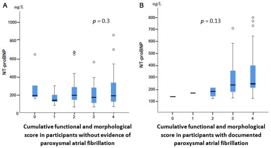 NT-proBNP levels in patients without and with morphological and functional abnormalities. Cumulative score of cardiac abnormalities was calculated as recommended by Pieske et al. (A) Cohorts without paroxysmal atrial fibrillation (pAF), (B) patients with pAF [].