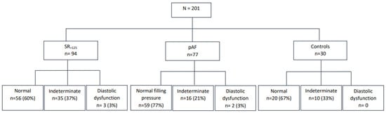 In the control group, diastolic function was indeterminate in 10 subjects (33%), while the remaining 20 (67%) had normal diastolic function. In the pAF group, 2 subjects (3%) had estimated high filling pressures, while 16 (21%) could not be assessed for filling pressures.