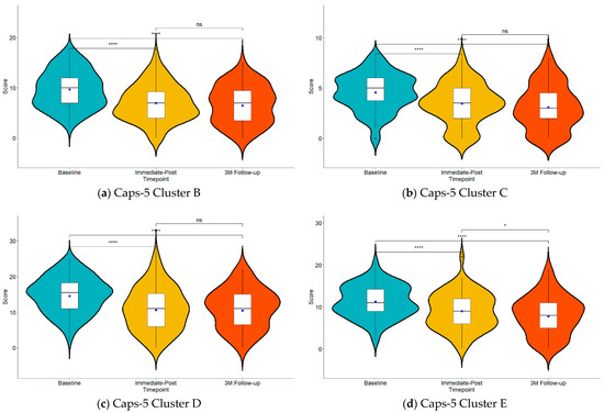 Table 2 shows the descriptive statistics of CAPS-5 cluster scores across different timepoints and studies. Note that 3 M Follow-up was only available for Study 3. All clusters showed a significant effect for timepoint for Baseline vs. Immediate-Post and for Baseline vs 3 M Follow-up. For Cluster B (Figure 1a), the mixed-model analysis showed a significant effect of timepoint (F (2, 182.82) = 49.12, p < 0.001) with a large effect size (η2p = 0.35, 95% CI [0.24, 0.44]). The fixed effects of timepoint further indicated significant differences between Baseline and Immediate-Post (b = −2.66, SE = 0.31, t (187.88) = −8.60, p < 0.001), as well as between Baseline and 3 M Follow-up (b = −3.18, SE = 0.41, t (178.16) = −7.84, p < 0.001). The post-hoc contrast testing the difference between Immediate-Post and 3 M Follow-up was not significant (b = −0.51, SE = 0.42, t (180) = −1.22, p = 0.445). For Cluster C (Figure 1b), the mixed-model analysis also showed a significant effect of Timepoint (F (2, 202.08) = 30.40, p < 0.001) with a large effect size (η2p = 0.23, 95% CI [0.13, 0.32]). The fixed effects of timepoint further indicated significant differences between Baseline and Immediate-Post (b = −1.12, SE = 0.17, t (191.65) = −6.43, p < 0.001), as well as between Baseline and 3 M Follow-up (b = −1.48, SE = 0.23, t (210.05) = −6.55, p < 0.001). The post-hoc contrast testing the difference between Immediate-Post and 3 M Follow-up was not significant (b = −0.36, SE = 0.24, t (159) = −1.50, p = 0.293). For Cluster D (Figure 1c), the mixed-model analysis similarly found a significant effect of timepoint (F (2, 192.31) = 42.46, p < 0.001) with a large effect size (η2p = 0.31, 95% CI [0.20, 0.40]). The fixed effects indicated significant differences between Baseline and Immediate-Post (b = −3.88, SE = 0.46, t (190.77) = −8.41, p < 0.001), as well as between Baseline and 3 M Follow-up (b = −4.08, SE = 0.61, t (193.42) = −6.66, p < 0.001). The post-hoc contrast testing the difference between Immediate-Post and 3 M Follow-up was not significant (b = −0.19, SE = 0.62, t (192) < 1). Lastly, for Cluster E (Figure 1d), the mixed model analysis showed a significant effect of timepoint (F (2, 184.52) = 37.30, p < 0.001) with a large effect size (η2p = 0.29, 95% CI [0.18, 0.38]). The fixed effects of timepoint indicated significant differences between Baseline and Immediate-Post (b = −2.33, SE = 0.35, t (190.82) = −6.57, p < 0.001), as well as between Baseline and 3 M Follow-up (b = −3.56, SE = 0.46, t (178.79) = −7.70, p < 0.001). In contrast to all other clusters, the post-hoc contrast testing the difference between Immediate-Post and 3 M Follow-up was also significant (b = −1.23, SE = 0.49, t (173) < −2.54, p = 0.032), indicating an additional drop in arousal and reactivity in the later phase following the end of treatment.