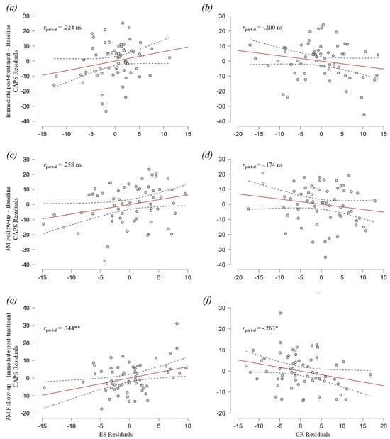 Partial regression plots for Expressive Suppression (ES) and Cognitive Reappraisal (CR) differences explaining the CAPS-5 difference. (a) Partial regression plot for ES and CAPS-5 differences from Baseline to Immediate-Post. (b) Partial regression plot for CR and CAPS-5 differences from Baseline to Immediate-Post. (c) Partial regression plot for ES and CAPS-5 differences from Baseline to 3 M Follow-up. (d) Partial regression plot for CR and CAPS-5 differences from Baseline to 3 M Follow-up. (e) Partial regression plot for ES and CAPS-5 differences from Immediate-Post to 3 M Follow-up. (f) Partial regression plot for CR and CAPS-5 differences from Immediate-Post to 3 M Follow-up. Dashed line area represents 95% confidence intervals. ns, p > 0.05, * p ≤ 0.05, ** p ≤ 0.01.