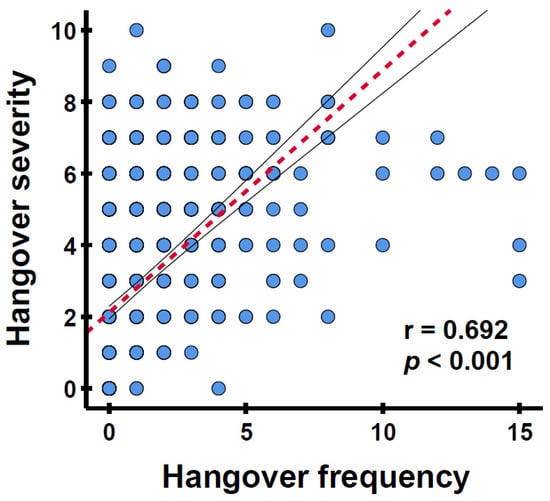 The relationship between hangover frequency and average hangover severity. Hangover frequency was assessed as occasions per month; hangover severity was rated on a scale ranging from 0 (absent) to 10 (extreme). The red striped line represents Spearman’s correlation. The black lines indicate the 95% confidence interval.
