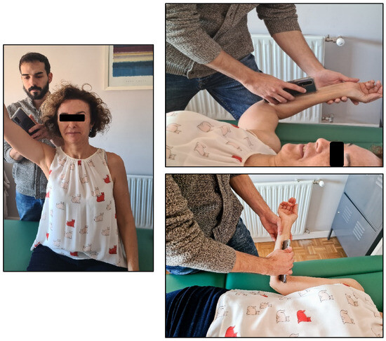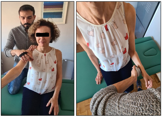 The shoulder active range of motion was assessed during the most painful shoulder movement using a smartphone inclinometer (www.plaincode.com, Plaincode Software Solutions, Gunzenhausen, Germany), where the use in shoulder flexion and abduction in a sitting position, external rotation at 0° abduction, external rotation at 90° abduction and internal rotation at 90° abduction in a supine position (Figure 1) has been validated, with results showing excellent inter-examiner reliability in symptomatic subjects (ICC > 0.80) [47].