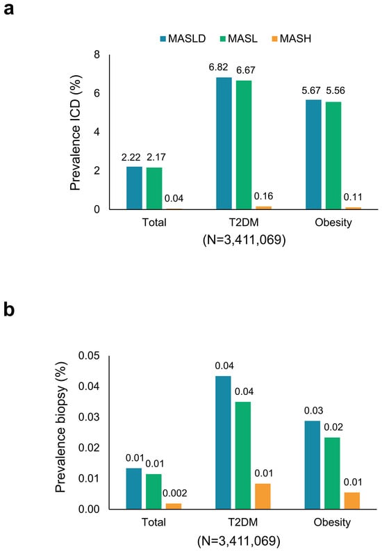 MASLD, MASL, and MASH prevalence in the overall population and in individuals with type 2 diabetes mellitus or obesity. The graphs show the proportion of individuals with MASLD, MASL, and MASH based on (a) ICD codification and (b) liver biopsy. ICD, International Classification of Diseases; MASLD, metabolic dysfunction-associated steatotic liver disease; MASL, metabolic dysfunction-associated steatotic liver; MASH, metabolic dysfunction-associated steatohepatitis; T2DM, type 2 diabetes mellitus.