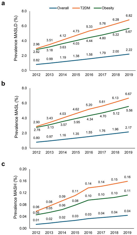 Trends in MASLD, MASL, and MASH prevalence in the overall population and in individuals with type 2 diabetes mellitus or obesity. The graphs show the prevalence of (a) MASLD, (b) MASL, and (c) MASH from 2012 to 2019. MASLD, metabolic dysfunction-associated steatotic liver disease; MASL, metabolic dysfunction-associated steatotic liver; MASH, metabolic dysfunction-associated steatohepatitis; T2DM, type 2 diabetes mellitus.