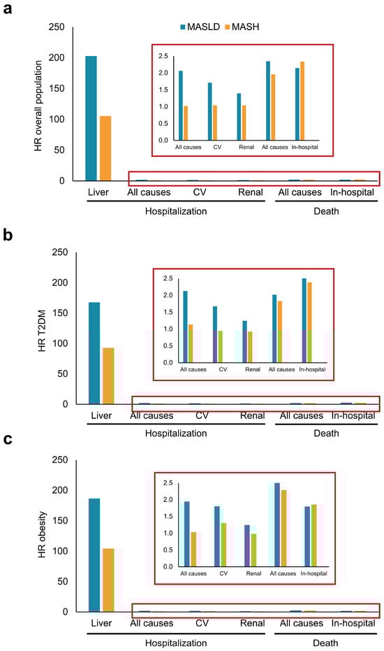 Annual relative risk of complications among patients with MASLD and MASH. The bar graphs show Hazard Ratios (HR) among individuals with MASLD and MASH in (a) the overall population and the populations with (b) type 2 diabetes mellitus (T2DM) and (c) obesity. CV, cardiovascular; MASLD, metabolic dysfunction-associated steatotic liver disease; MASH, metabolic dysfunction-associated steatohepatitis.