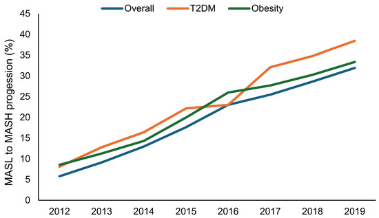 The proportion of people at risk of progression from MASL to MASH increased in the overall population and in individuals with T2DM and obesity from 2012 to 2019 (Figure 4).