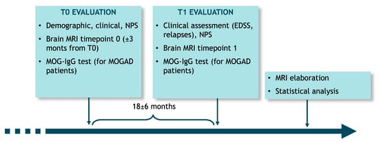 After signing written informed consent forms, patients entered the study at baseline (T0), where demographic and clinical variables were collected. A neuropsychological assessment was also performed, as well as a brain MRI scan (±3 months from baseline) and a serum MOG-IgG test. At T1 evaluation, which followed the baseline visit after 18 ± 6 months, a clinical assessment was performed, as well as a new brain MRI and a serum MOG-IgG test for MOGAD patients. Each patient underwent a longitudinal and cross-sectional (at baseline) evaluation of brain MRI images through dedicated software (Figure 1).