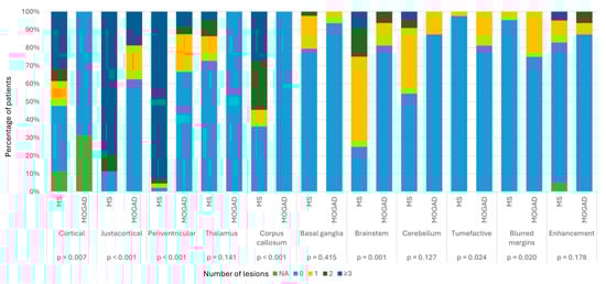 Percentage of MOGAD versus MS patients with 0, 1, 2 or ≥3 lesions in different brain areas.