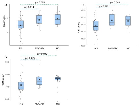 Mean PBVC/y was significantly different among MOGAD patients (−0.143 ± 0.366%), MS patients (−0.502 ± 0.444) and HC subjects (−0.07 ± 0.425%, p = 0.002); a post hoc analysis using Tukey’s test showed significantly higher mean PBVC in MS patients compared to MOGAD patients (mean difference −0.359, p = 0.014) and to HC subjects (mean difference −0.428, p = 0.005) (Figure 3A).