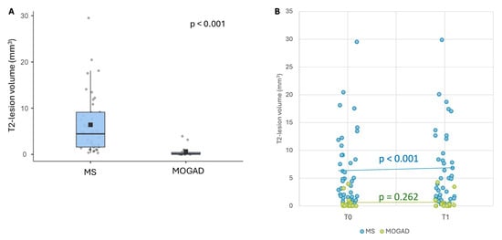 T2 lesion load. (A): T2 lesion volume at T0. Horizontal black bars represent median values. Squares are means; (B): T2 lesion volume distribution at T0 and T1 in MOGAD and MS patients.