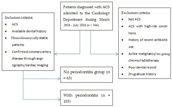 - Group WP (with periodontitis) comprised 103 patients (60 men—61.2% and 40 women—38.8%) diagnosed with ACS based on clinical presentations, EKG findings, and cardiac enzyme levels and presenting with a dental history of periodontitis with or without prior treatment.
