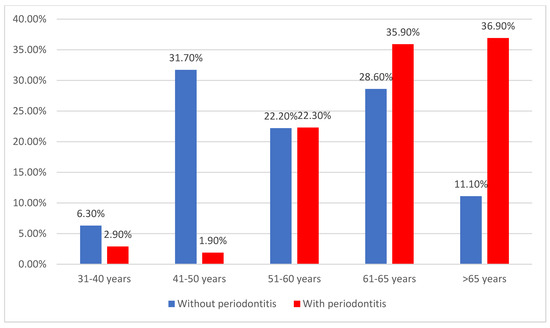 As displayed in Figure 2, most of the patients were between 6 and 65 years old (33.1%) or above 65 years old (27.1%). Significant differences were observed between groups (p < 0.001). Patients with an age between 41 and 50 years presented significantly less frequently periodontitis (31.7% vs. 1.9%), while patients with an age above 65 years presented periodontitis significantly more frequently (36.9% vs. 11.1%).