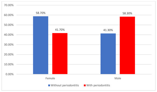 Regarding sex, besides being the dominant category diagnosed with ACS in this study (51.8%), men were associated with periodontitis significantly more often (58.3% vs. 41.3%) (p = 0.038) (Figure 3).