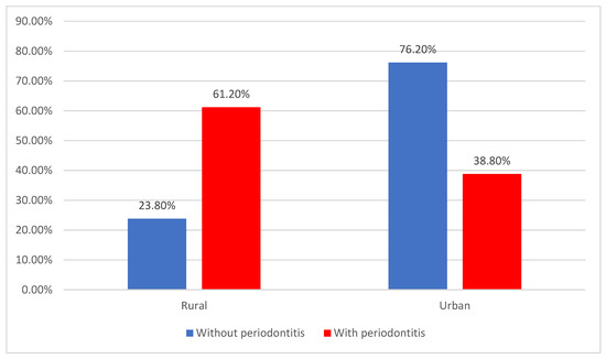 According to Figure 4, the background distribution shows a majority of patients living in urban environments (53%), with those living in rural environments significantly more associated with periodontitis (61.2% vs. 23.8%) (p < 0.001).