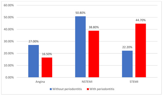 According to the type of acute coronary syndrome, NSTEMI (43.4%) and STEMI (36.1%) were the most frequent among patients, with STEMI being significantly more associated with periodontitis (44.7% vs. 22.2%) (p = 0.011) (Figure 5).