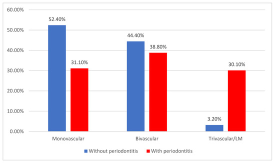 Regarding the type of coronary artery disease, monovascular (39.2%) and bivascular (41%) diseases were the most observed (Figure 7). Monovascular coronary artery disease was significantly less associated with periodontitis (52.4% vs. 31.1%), while patients with trivascular/LM localization were significantly more associated with periodontitis (30.1% vs. 3.2%) (p < 0.001).