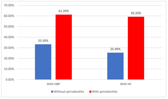 As displayed in Figure 8, 50.6% of patients already presented high blood pressure before the major coronary event, with 46.4% of patients suffering from heart failure. Both conditions were significantly more associated with an increased risk of ACS, as well as periodontitis (HBP—61.2% vs. 33.3%, p = 0.001, HF—59.2% vs. 25.4%, p < 0.001).