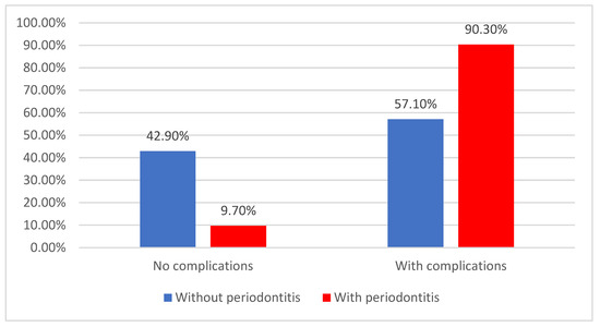 After the major coronary event, 77.7% of patients developed cardiovascular complications (acute valvulopathy, pulmonary edema, cardiogenic shock, arrythmias, etc.), with the individuals affected by periodontitis being significantly more predisposed to them (90.3% vs. 57.1%) (p < 0.001) (Figure 9).