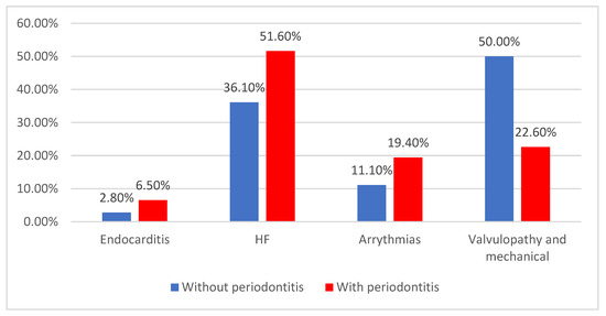 Among the type of cardiovascular complications, heart failure (47.3%), valvulopathies, and mechanical complications (30.2%) developed more frequently, with patients with HF being significantly more associated with periodontitis (36.1% vs. 51.6%) (p = 0.030) (Figure 10).