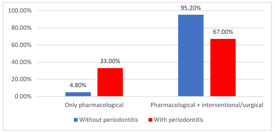 As exhibited in Figure 11, most patients underwent both pharmacological and interventional/surgical treatments (77.7%). Patients who underwent only pharmacological treatment (due to difficult coronary anatomy, refusal of coronary artery bypass graft surgery, major complications during coronary angiography resulting in the cessation of the intervention, the hemodynamic status of the patient not allowing the procedure to be carried out again, etc.) were significantly more associated with periodontitis (33% vs. 4.8%) (p < 0.001).