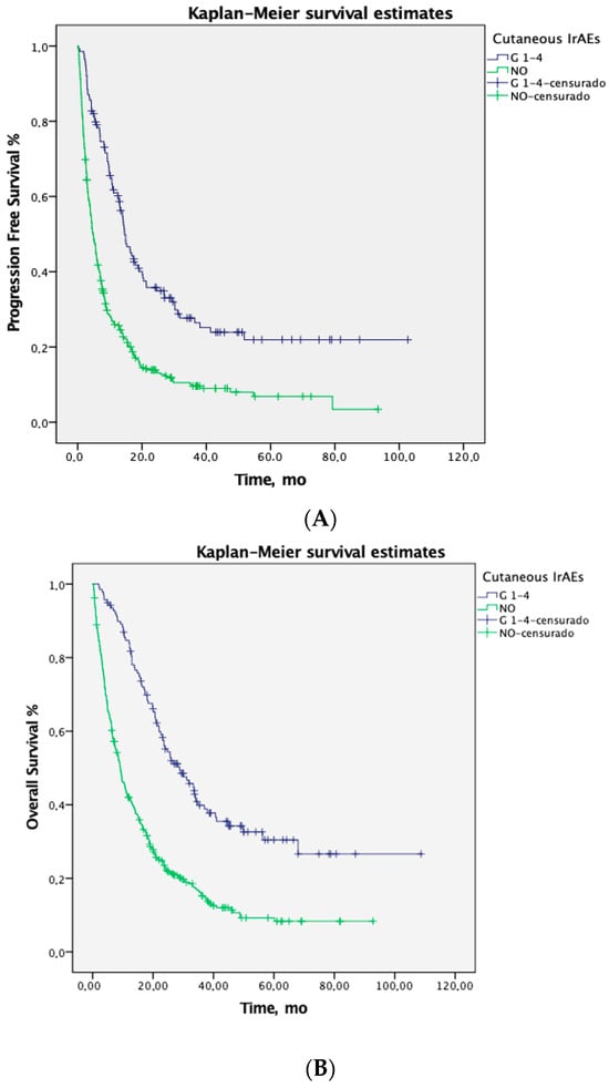 Kaplan-Meier survival estimates of progression-free (PFS) (A) and overall (OS) (B) survival for patients who experienced cirAE vs. those that did not. (A) Median PFS in patients with cirAE 14.6 m (IC95% 12.3-16.8) vs. 4.7 m (IC95% 3.9-5.5) in those that did not.; p = 0.0001); (B) Median OS in patients with cirAE 29 m (IC95% 21.3–33.6) vs. 9.2 m (IC95% 7.7–10.6; Log Rank (Mantel-Cox) (p = 0.0001).