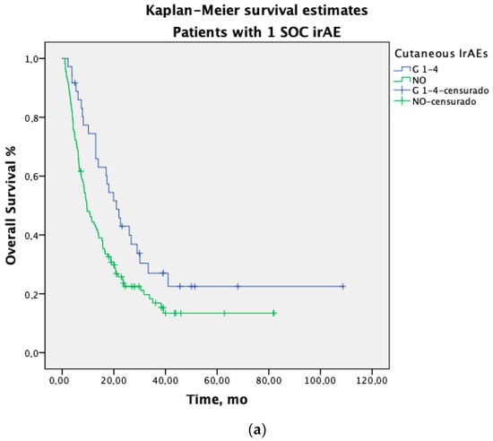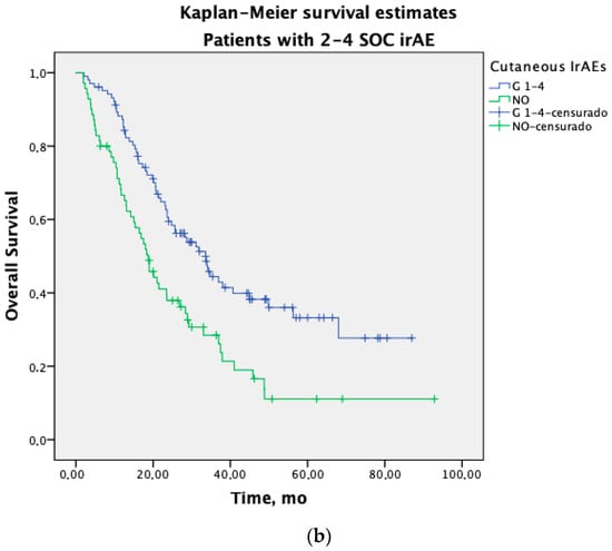 Additionally, to further examine the prognostic independence of the number of SOCs and cutaneous irAEs, we show a stratified analysis of PFS (Figure A1) and OS (Figure 2). The median PFS was significative longer in patients with ≥2 SOC irAEs who experienced cirAE than in those with other irAEs; 15.2 months (95% CI 11.1–19.4) vs. 10.5 months (95% CI 6.4–14.7); p = 0.002. PFS HR: 0.79 (95% CI 0.65–0.96), p. 0.016. The PFS in patients with only 1 SOC and cirAE was 10.6 months (95% CI 4.2–17.1) vs. 6.5 months (95% CI 4.8–8.1) with other SOCs; p = 0.637. HR:1.11 (95% CI 0.96–1.29), p = 0.637.