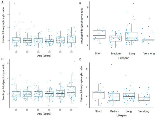 Age-related and survival-associated trends in NLR. Longitudinal trends in NLR with age are shown for men (A) and women (B), while cross-sectional survival-associated trends in NLR are depicted for men (C) and women (D). In the box-and-whisker plots, the bold line within each box represents the median, with the lower and upper edges indicating the first and third quartiles, respectively. Whiskers extend to the most extreme values within 1.5 times the interquartile range (IQR), and data points beyond this range are plotted as outliers.