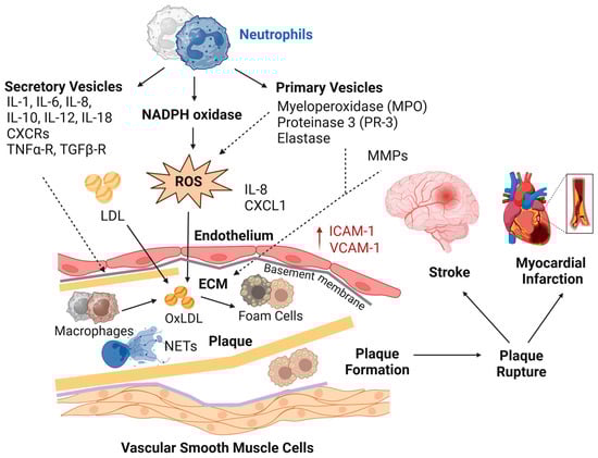 Neutrophils play a crucial role in the initiation, progression, and destabilization of atherosclerotic plaques through the release of cytokines and ROS, proteolytic enzymes, and neutrophil extracellular traps (NETs) [52,53,60,61,62,63]. Upon recruitment to inflamed endothelium via chemokines such as CXCL1 and CXCL8, neutrophils exacerbate vascular inflammation by releasing pro-inflammatory cytokines, including IL-1β, IL-8, and tumor necrosis factor-α (TNF-α), which amplify endothelial dysfunction and promote monocyte adhesion. Neutrophil-derived ROS, primarily generated by nicotinamide adenine dinucleotide phosphate (NADPH) oxidase (NOX2) and myeloperoxidase (MPO), contribute to oxidative stress, endothelial damage, and the oxidation of low-density lipoproteins (OxLDL), which drive foam cell formation and atherogenesis [53,64]. Moreover, neutrophil elastase (NE) and matrix metalloproteinases (MMPs) degrade extracellular matrix (ECM) components, weakening the fibrous cap and increasing the risk of plaque rupture, which can lead to cardiovascular events such as stroke and myocardial infarction (Figure 2).