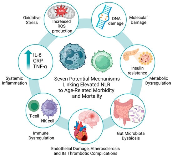An elevated NLR reflects an imbalance between an overactive innate immune system and a declining adaptive immune system. Neutrophils, central to the innate immune response, increase during systemic inflammation and stress, while lymphocytes, essential for adaptive immunity, decline with age due to thymic involution, reduced T-cell diversity, and impaired immune function. Chronic systemic inflammation, reflected in elevated NLR, drives the development of multiple age-related diseases, including metabolic dysfunction, cancer, and cardiovascular disease [4,5,7,56]. Neutrophils produce reactive oxygen species (ROS) during inflammation [53,57], and chronic ROS production promotes molecular damage to DNA, lipids, and proteins. This triggers a vicious cycle of oxidative damage, chronic inflammation, and cellular dysfunction, including mitochondrial dysfunction, accelerating biological aging and increasing susceptibility to CVD, cancer, and other age-related pathologies [1,5,58].