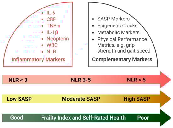 Among the biomarkers used to assess chronic systemic inflammation, the neutrophil-to-lymphocyte ratio (NLR) has emerged as a promising and easily accessible biomarker of immune dysregulation in aging. NLR, which is a simple and accessible metric derived from neutrophil and lymphocyte counts, provides a dynamic view of the immune landscape, encapsulating innate immune activation and adaptive immune suppression. This simple and cost-effective biomarker has recently emerged as a valuable tool for evaluating systemic inflammation and immune dysregulation in the context of aging. Furthermore, it has shown promise in predicting clinical outcomes, including physiological resilience and long-term survival [7,8,9,10].