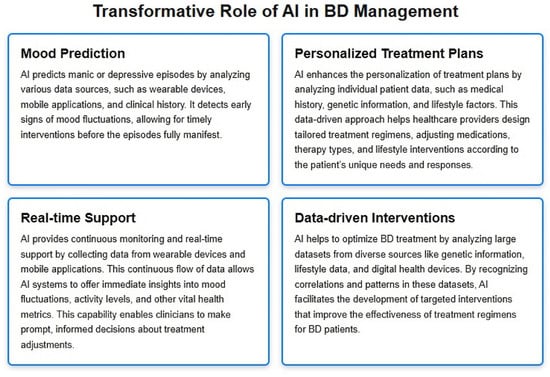 | 2.10. Discussing the Future of AI in BD Treatment | AI’s potential for early detection of BD, personalized treatment strategies, and the challenges of accessibility, data privacy, and bias in algorithms. | The future of BD treatment lies in advancing AI capabilities, but challenges such as equity, accessibility, and ethics need to be addressed. |