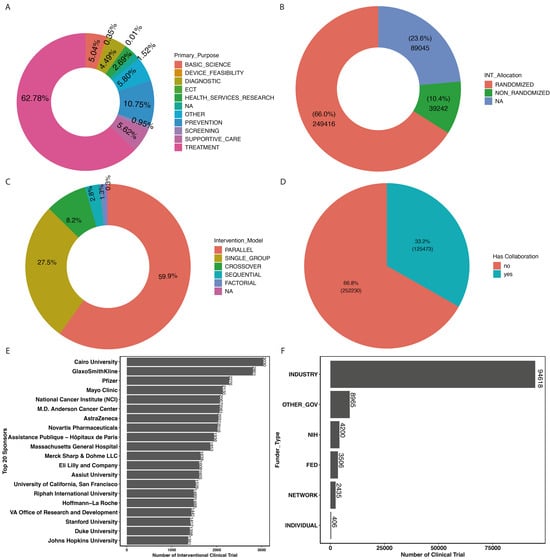 (A) Distribution of clinical trials by their primary purpose; (B) interventional clinical trials by allocation; (C) distribution of interventional study model; (D) distribution of clinical trials by collaboration status; (E) top 20 sponsors of interventional clinical trials; (F) distribution of funder type for the clinical trials conducted in last two decades.