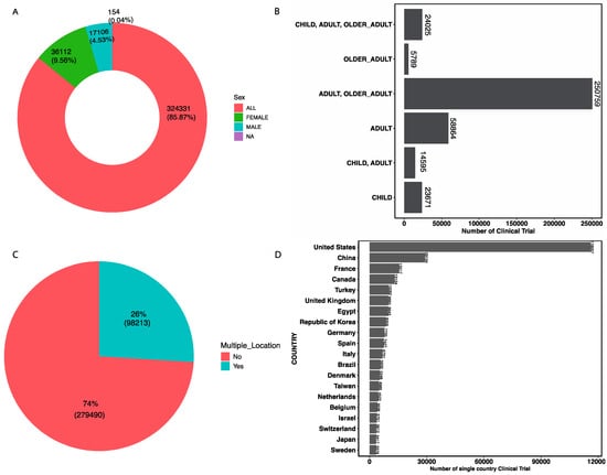 (A) Overall distribution of clinical trial participants by sex; (B) overall distribution of clinical trial participants by age group; (C) clinical trials with multiple locations; (D) distribution of clinical trials conducted in a single country.