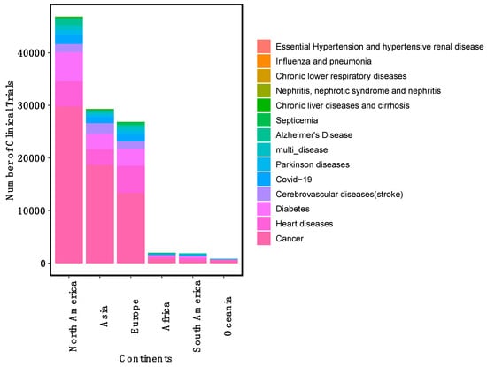 Distribution of clinical trials by continents and disease for the last two decades.